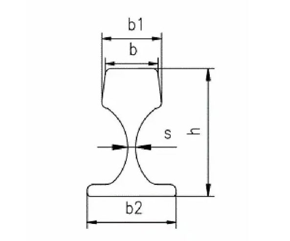 | Size | Head (mm) | Height (mm) | Base (mm) | Web (mm) | Nominal weight (kg/m) | Material | Length (m) |